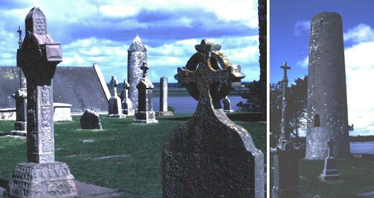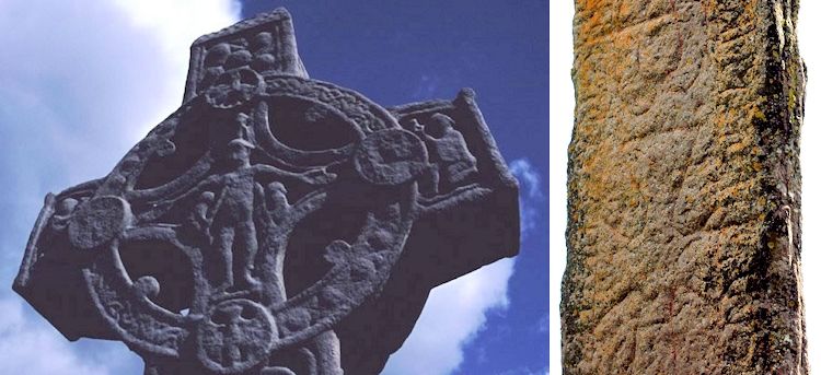 Ovan t.hö. Cross of Scriptures, Clonmacnoise, Irland 1000-tal. T.vä. Kristen runsten vid Källby Hallar,