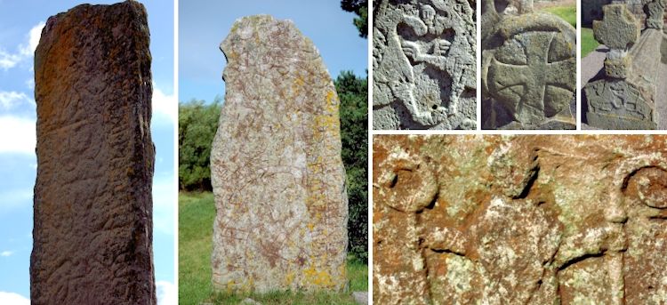 Ovan t.vä. Runstenarna vid Källby Hallar, Västergötland ca 900-1100. T.hö. gravutsmyckningar Husaby kyrka,