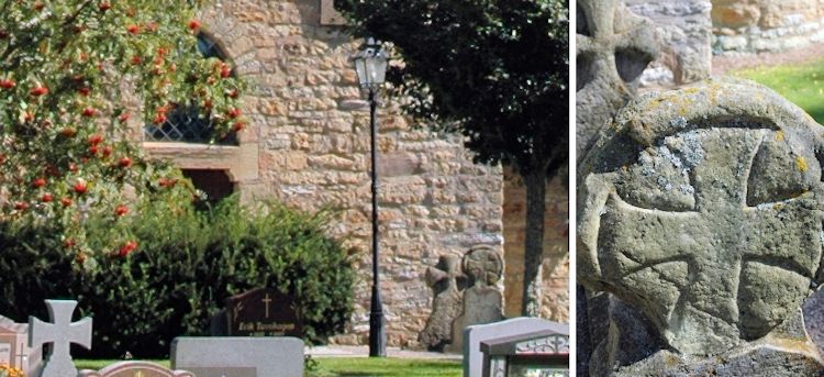 Sarkofagen med korsen utanför ingången till Husaby kyrka benämndes länge som Olof Skötkonungs grav, men det har visat sig vara ett felaktigt antagande. Vem graven tillhört är okännt. Foto Tommy Sörstrand.