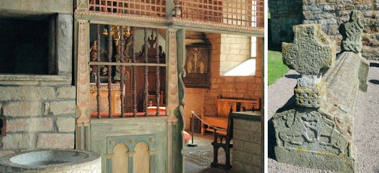 Ovan t.vä. bevarad unik medeltida inredning i Husaby kyrka. Korskrank i trä och Ambon, ett hål i muren där prästen kunde predika för församlingen, är synnerligen unika för Svenska kyrkor. T.hö. Lejonsarkofagen, som kan vara Biskop Unnis grav. Foto Tommy Sörstrand.