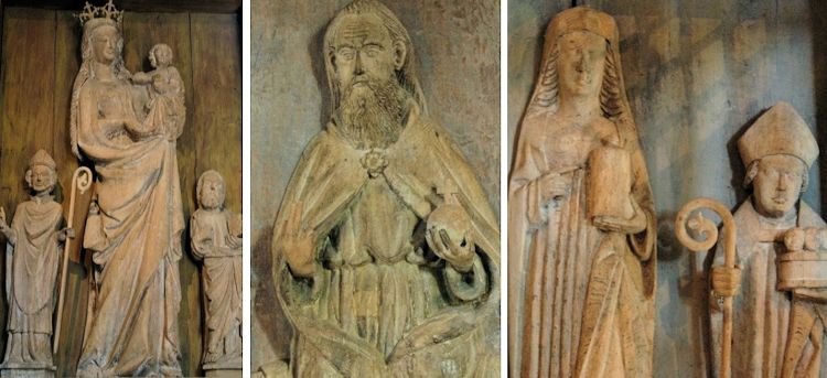 Träskulpturer från Husaby kyrka. Träskulpturen ovan t.hö. som håller fram tre avhuggna huvuden är Biskop St Sigfried som enligt legenden lät döpa Olof Skötkonung. Kanske är det honom man avbildat i mitten ovan. Skulpurerna är från 1400-talet. Foto Tommy Sörstrand.