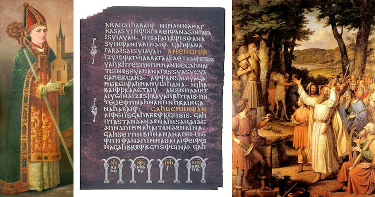 Ovan t.hö. Ansgar överlämnar kyrkan S:t Trinitatis i Altona, målning av Siegfried Detlev Bendixen. Mitten: En sida ur den unika Silverbibeln, en unik handskriven evangeliebok på det numera utdöda språket gotiska från början av 500-talet. T.vä. En gode leder troende under en offerritual till guden Tor. Målning av J.L. Lund. Bilderna hämtade frpn Wikipedia.