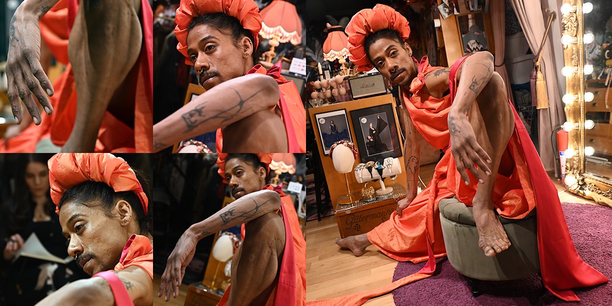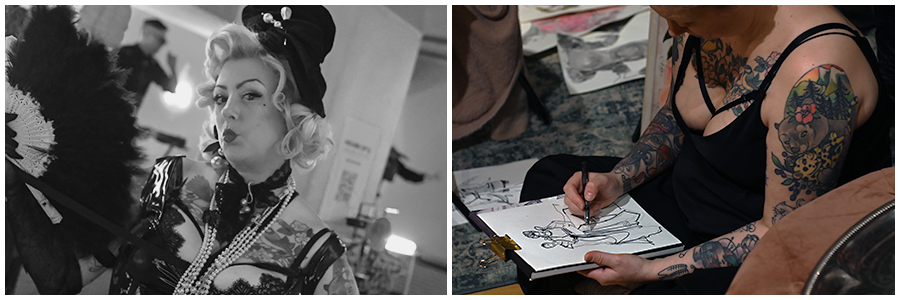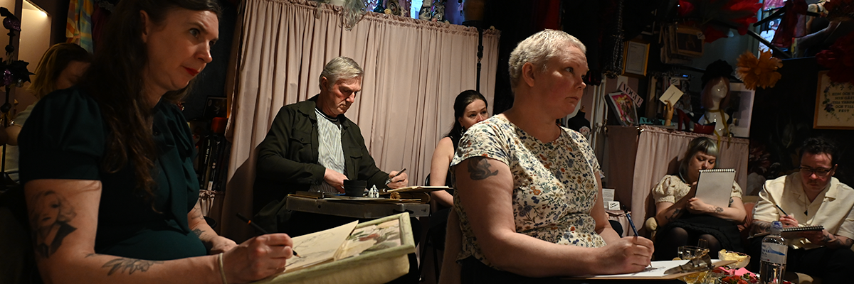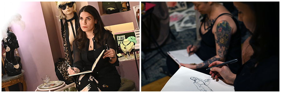 Bryta mönster och tänka utanför ramen utmanar och gör oss överraskade. Något som behövs för att aktivera kreaktivitet och skaparglädje. Tror att de flesta har en ganska bra bild av vad teckna croqui innebär, men när jag fick inbjudan och lokalen var La Petite Mort förstod jag att detta var något annorlunda och blev intresserad. La Petite Mort på Grevgatan invid Karlaplan är Linda Lindgrens studio, butik och showroom och Linda är en av våra stora klädskapare, med kreationer som burits av både Dragqueens och Mellopresentatörer. Linda och jag brukar stöta på varandra i olika sammanhang där vårt gemensamma intresse för Burlesque och Pride ryms, men det var första gången jag besökte henne på hemmaplan. Den svartvita bilden nedan är från ett evenemang på House of Q och Club Nexus februari 2026.