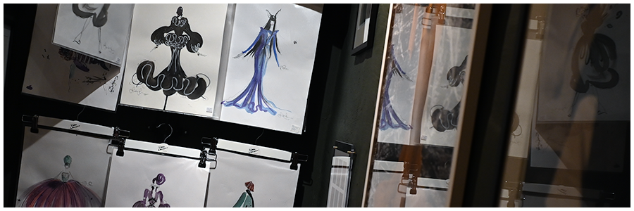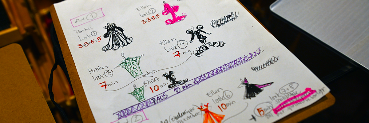 Inredningen och formgivningen av lokalen är signerad Linda Lindgren och är något som vuxit fram och utvecklats över tid. - Jag har gjort allt själv och fått lokalen precis så som jag vill ha den, sa hon när jag med flera berömde atmosfären och hur bra den fungerade som inspiration till kreativt arbete. Hon berättade då att det inte var första gången som den använts för kreativa syften. En skrivargrupp hade varit här, men det var första gången som Lindas modeskapande direkt kombinerades med ett annat uttrycksmedel. Annars är tecknandet och skissandet självklart en naturlig del för henne i processen med att hitta fram till en kreation och i lokalen fanns hundratals kanske tusentals teckningar.