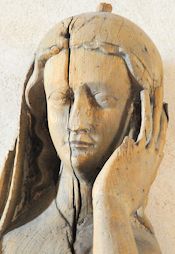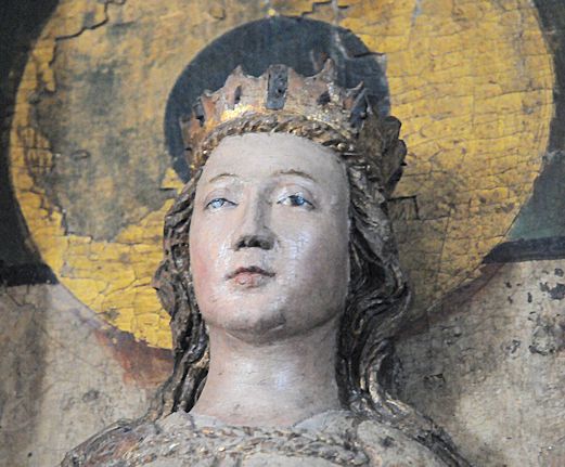 Detalj av träskulptur över heliga Katarina, Torhälla kyrka, 1400-tal. Foto Tommy Sörstrand.