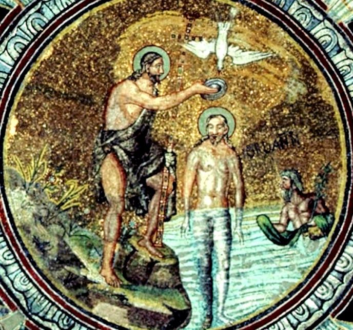 Det är alltså Jesus som ger dopets vatten dess kraft. Det är han som gör att det kan skänka syndernas förlåtelse. Jesus själv visas som en pojke utan skägg, inte för att han var liten vid sitt dop utan för att markera att man i dopet föds på nytt. Att han är naken är inte bara en praktisk detalj; det visar att han är en ny Adam, den förste i en ny mänsklighet utan skuld. Att vattnet tornar upp sig runt honom och liksom vill svälja honom är en påminnelse om att dopet också är en begravning. Jesus fullbordade sin gärning genom att dö på korset, och Paulus skriver: