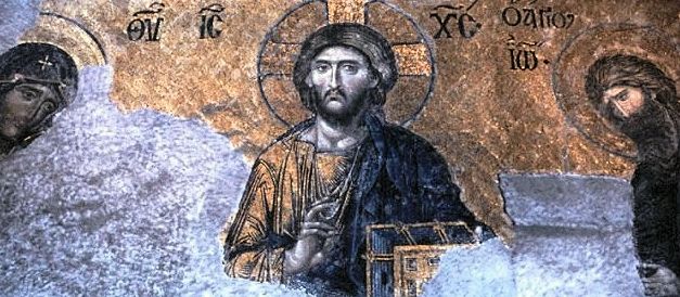 Deesimosaiken från det södra galleriet i Hagia Sofia. Man tvistar om när denna magnifika mosaik gjordes. De flesta är överrens om att detta är ett av de största mosaikarbeten i Konstantinopel och en skola hävdar att detta var ett verk tillängnat Michael VIII Palaiologos för hans återerövring 1261 av staden efter korsriddarnas sextioåriga belägring. Det tvistas fortfarande om den exakta dateringen av verket. Deesi är en ikonterm som används för att beskriva scenen där Kristus är avbildad beende mellan Jungfru Maria och Johannes Döparen. Kompositionen är en av de äldsta kristna ikonmotiven.