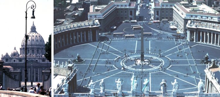 De två mest ryktbara byggnaderna i antikens Rom. Endast en konstruktion i betong, ett material som romarna använde, men som blivit bortglömt under medeltiden, skulle vara starkt och billigt nog för Bramantes behov. Genom att återuppliva denna gamla teknik bröt han väg för en ny epok i arkitekturens historia. Uppförandet gick långsamt och när Bramante dog 1514 hade endast de fyra murpelarna kring korsmitten blivit byggda. 1546 tar Michelangelo över bygget och kyrkans nuvarande utseende är i hög grad utformad efter hans idé. För att ge kyrkan en värdig inramning byggdes den väldiga Petersplatsen. Roms nya Campidoglio, Capitolinska kullen, som var det antika Roms symboliska centrum. Berninis kolonnad från 1657 ramar in torget. Lorenzo Bernini är också arkitekten bakom många av Peterskyrkans inre utsmyckningar. Den väldiga bronsbaldakinen under kupolen och de fyra vridna kolonnerna är två exempel. Naturligtvis var de interiöra utsmyckningarna inte bara av arkitektonisk art. Michelangelos målningar i Sixtinska kapellet hänför alla och har blivit symptomatiskt med Vatikanstaten och det Påvliga inflytandet än idag.