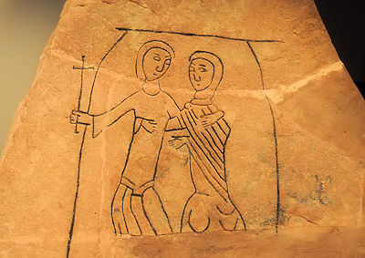 Stenrelief med kristet budskap ovan till vänster 300-tal. Marmorrelief av ängeln Gabriel 300-tal.