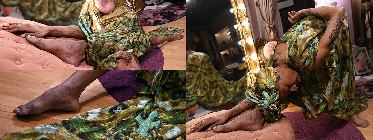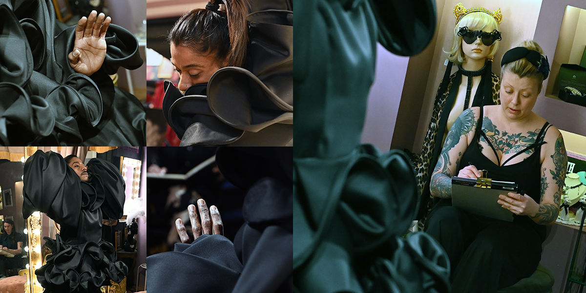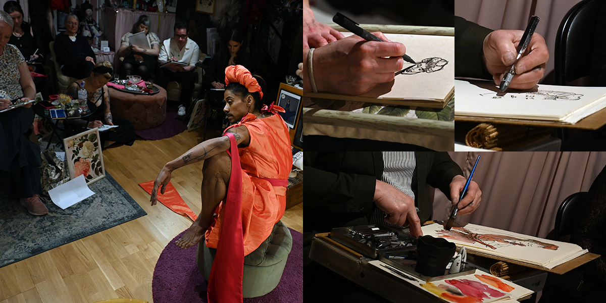 Bryta mönster och tänka utanför ramen utmanar och gör oss överraskade. Något som behövs för att aktivera kreaktivitet och skaparglädje. Tror att de flesta har en ganska bra bild av vad teckna croqui innebär, men när jag fick inbjudan och lokalen var La Petite Mort förstod jag att detta var något annorlunda och blev intresserad. La Petite Mort på Grevgatan invid Karlaplan är Linda Lindgrens studio, butik och showroom och Linda är en av våra stora klädskapare, med kreationer som burits av både Dragqueens och Mellopresentatörer. Linda och jag brukar stöta på varandra i olika sammanhang där vårt gemensamma intresse för Burlesque och Pride ryms, men det var första gången jag besökte henne på hemmaplan. Den svartvita bilden nedan är från ett evenemang på House of Q och Club Nexus februari 2026.