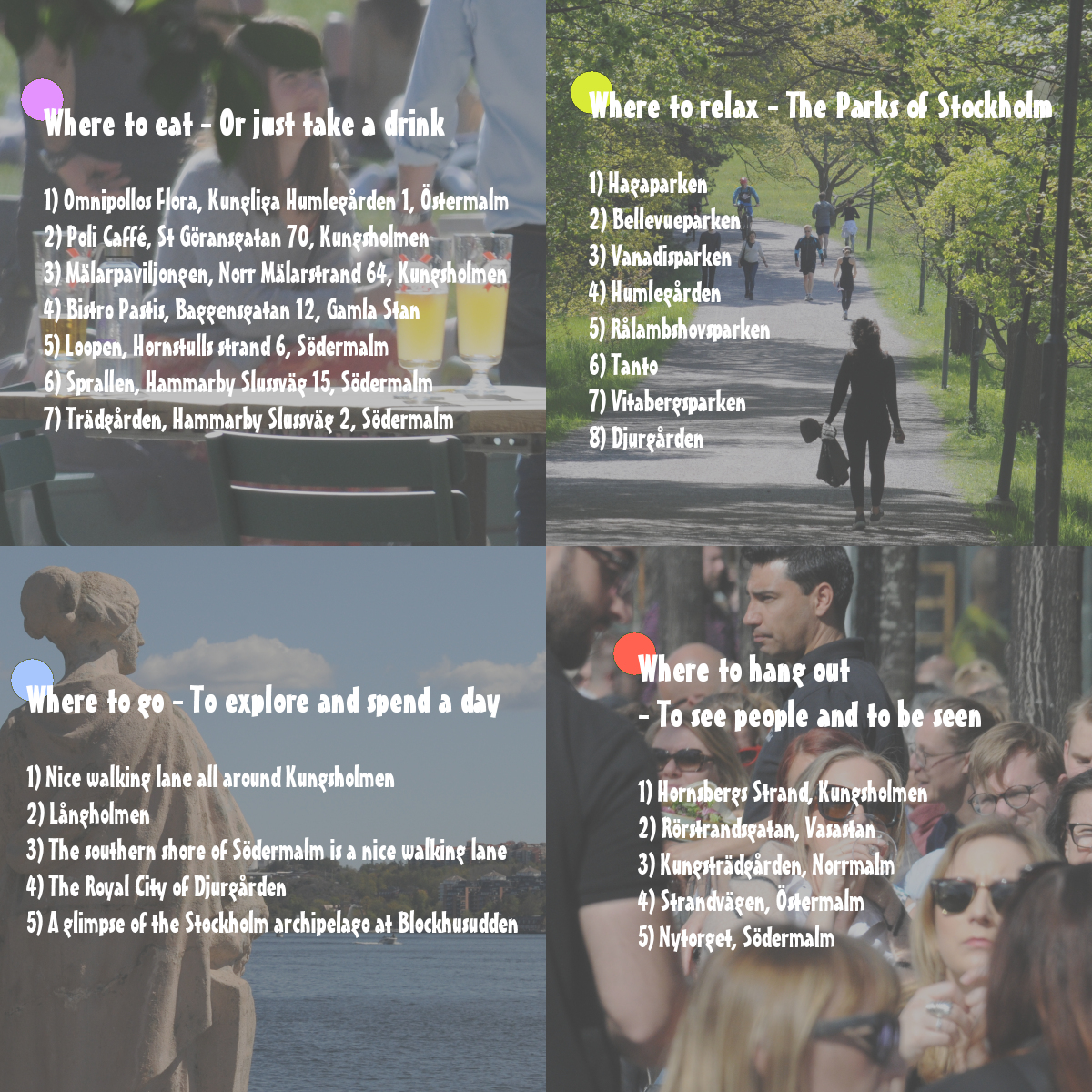 When your done with the hints from all tourist guides this might help you to find the soul of Stockholm. It is a personal guide that only cover day-time activities and probably not suit everybody. For night-time activities I