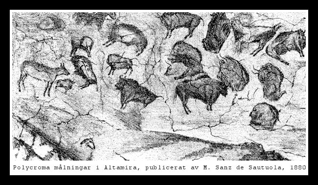 Vårt besök blev lite av en besvikelse eftersom vi inte gavs tillträde till grottan. Utanför grottan hade ett showroom och museum byggts upp vilket i och för sig var spännande, men vi hade förväntat oss någonting annat. Vi fick i alla fall ta del av historien bakom upptäckten. Altamiragrottan upptäcktes 1868 av jägaren Modesto Cubillas. Han hittade ingången till grottan när han försökte befria sin hund, som hade fastnat i en spricka i berget, efter att ha jagat ett byte. Upptäckten av ännu en grotta i detta grottäta område väckte inte det minsta intresse bland grannarna i området. Fossilforskaren, paleontologen Marcelino Sanz de Sautuola, fick höra om upptäckten förmodligen direkt av Cubillas, som arrenderade ett stycke mark på hans gård. Det tog dock sju år innan han besökte grottan. Han gick igenom hela grottan, trodde han, och kunde endast konstatera vissa abstrakta tecken i form av svarta ränder, men han betraktade dem inte som något mänskligt verk. Fyra år senare, sommaren 1879, återvände Sautuola för andra gången till Altamira. Nu tillsammans med sin dotter Mary, 9 år. Han ville gräva vid ingången till grottan för att se om han kunde hitta några rester av ben och flinta. Under tiden tog sig flickan upp till ett sidorum, där hon såg några målningar i taket och skyndade tillbaka till sin far. Sautuola fick se den magnifika samlingen av målningar som täckte praktiskt taget hela valvet. Följande år 1880, offentliggjorde Sautuola en kort pamflett med titeln Korta noteringar om några förhistoriska föremål. Den beskrev det förhistoriska ursprunget för målningarna och inkluderade en grafisk återgivning. Han visade sin avhandling för professorn i geologi vid universitetet i Madrid, Juan Vilanova, som tog emot den som sin egen. Trots detta, accepterades inte Sautuolas teori av Fransmännen Cartailhac, Mortillet och Harlan, de mest kända vetenskapliga experterna i förhistoriska och paleontologiska studier i Europa på den tiden.