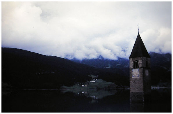Den dränkta kyrkan i byn Curon, Val Venosta 1997 |