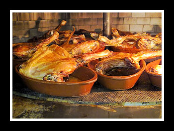 En av männen mumlade något, reste sig från bardisken och ledde oss längs en korridor längre in i lokalen till en stängd dörr. Han pekade på dörren och lämnade oss. Vi tittade undrande på varandra. Hade han fattat rätt eller var detta toaletten. Vi öppnade dörren och framör oss uppenbarade sig en liten matsal med sex bord där tre gäster satt vid två av borden. Borden var dukade med vita linnedukar och vi nickade instämmande åt varandra. En servitör kom ut från det angränsande köket, hälsade oss välkommen och visade oss till ett av de lediga borden. Mannen vi bordet bredvid hade tagit in ett rejält stycke kött som såg ut som hela framdelen på en gris och jag sa till servitören att det där vill vi också ha. Det blev en helt fantastisk lunch. Köttet var helt otroligt mört och välsmakande. Servtören berättade om den långa tillagningstiden, som var anledningen till det goda resultatet. Mätta och mycket belåtna med vår lunch kunde vi fortsätta den sista biten till vårt utflyktsmål.