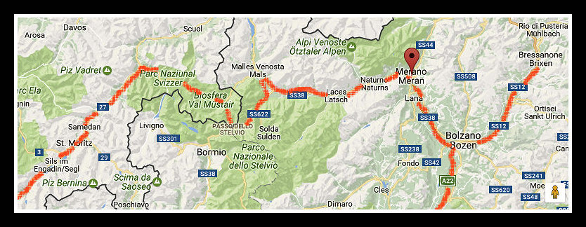 Det blev några oförglömliga dagar i Venosta dalen, Val Venosta, eller Vinschgau som de tyskspråkiga säger. Här färdades Romarna och här finns tidiga spår av Kristindomens nordliga mission. Floden Adige har i alla tider gett liv åt dalen och har sin källa vid passet Reschen alldeles vid gränsen till Österrike och Schweiz. Floden ringlar sig mellan bergsmassiven österut till Merano där den strålar samman med floden Passer som kommer från norr. Dalens betydelse har i alla tider varit stor eftersom den skapat en lättillgänglig väg norrut genom Alperna. Här vandrade även Özzi, den ganska välkände mansmumien som hittades 5 000 år efter sin ödesdigra promenad över passet.