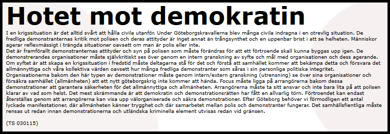 Jag har alltid varit lite naiv samtidigt som jag haft lite svårt för att ta ställning. Att bli älskad av alla är nog omöjligt och risken är då överhängande att innehållet blir urvattnat och inte den provokation som oftast behövs för att väcka folk. Texten ovan från 2003 överaskar med sitt tydliga ställningstagande. Idag skulle jag nog söka en bredare vy och förståelse, men ämnet är lika aktuellt och ifrågasättandet av demokratin högst närvarande även idag.