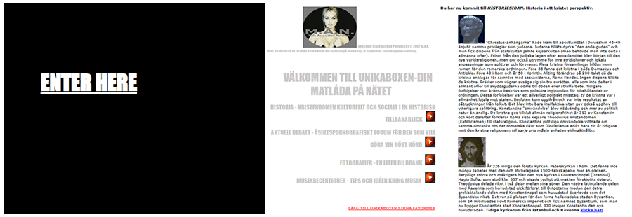I början var designen trevande, ganska enkel men lekfull. Såsmåningom fick sajten i alla fall en navigering. Den grafiska profilen var fortfarande spretig och otydlig. Den helsvarta startsidan med endast Enter Here var ett försök att vara lite hemlig och lockande. De grafiska elementen skapades utan något gemensamt sammanhang och jag hade svårt att hålla ihop det hela. Kristendomshistorian hade sin tidsaxel som ett gemensamt och samlat uttryck, men resten av sajten blev mest som en illa skött anslagstavla. Ingen ordning överhuvudtaget, men ett härligt kaos att verka i. Jag försökte också kommunicera med publiken genom en öppen brevlåda, som tidigt fick stängas ner efter intrång av Ryska nättroll.